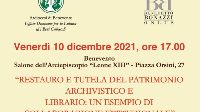 Venerdì prossimo, 10 dicembre, alle 17, nel Salone “Leone XIII” dell’Arciepiscopio a Benevento, Piazza Orsini 27, si terrà la manifestazione del titolo “Restauro e tutela del patrimonio archivistico e librario: un esempio di collaborazione istituzionale”.