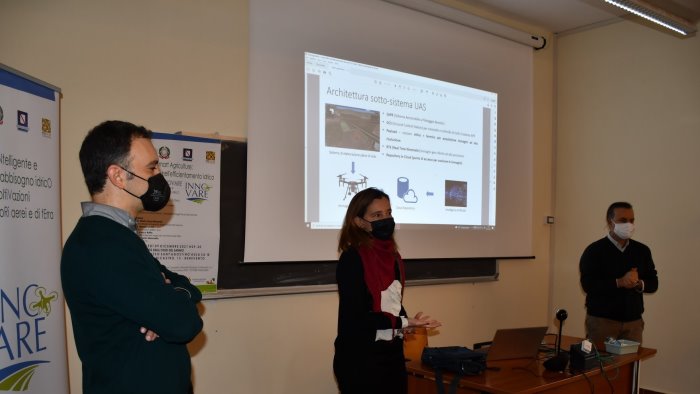 Alla presenza degli studenti del Corso di Laurea Magistrale in Ingegneria Informatica, dopo l’apertura della Professoressa Lerina Aversano la quale ha evidenziato come la tecnologia utilizzata dal progetto e i risultati raggiunti da “Innovare” siano stati frutto anche dell'eccellente lavoro di ricerca svolto dal team di ricerca e sviluppo, è toccato all’Ing. Marco Leone del CeRICT scrl entrare nel merito del progetto, con un intervento sullo studio delle soluzioni ingegneristiche che hanno portato poi all'utilizzo di sensori in fibra ottica per la misura dello stato idrico del suolo, mentre l’Ing. Alberto Mennella della Società TopView ha approfondito la tematica relativa all’impiego dei droni per la rilevazione delle immagini da fornire all'IA per l’elaborazione della migliore strategia di irrigazione e gestione della coltivazione.