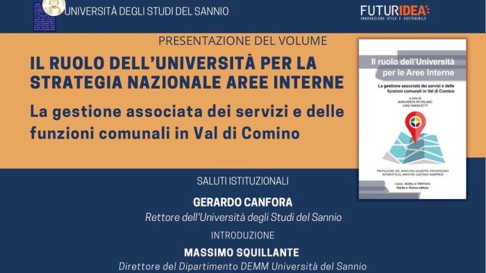 "Il ruolo dell'Università per la Strategia Nazionale Aree Interne. La gestione associata dei servizi e delle funzioni comunali in Val di Comino". Questo il titolo del volume, a cura di Luigi Famiglietti e Margherita Interlandi, che sarà presentato domani, giovedì 10 marzo, alle 16, presso la sala conferenze di Futuridea, in contrada Piano Cappelle a Benevento.