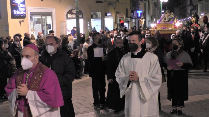 Subito dopo dell'Eucaristia monsignore Accrocca seguito da tantissimi fedeli ha raggiunto la chiesa di Sant'Anna, nel centrale Corso Garibaldi tra due ali di folla che hanno atteso l'uscita del Cristo morto e della Madonna Addolorata. La processione ha percorso il Corso, viale Mellusi ed altre strade cittadine sempre tra la commozione dei fedeli. Presenti le associazioni, i vertici delle forze dell'ordine e i rappresentanti istituzionali, a partire dal Prefetto Carlo Torlontano e dal sindaco di Benevento, Clemente Mastella: “Con le dovute e debite precauzioni – ha rimarcato il primo cittadino – è il ritorno alla normalità. Ora siamo nella morte, domani nella resurrezione. Un piacevole risveglio da un torpore che ci ha affievolito e fatto arrancare”. Poi un pensiero al popolo ucraino da parte del sindaco Mastella: “Questa disattesa guerra ci sta mettendo duramente alla prova”.