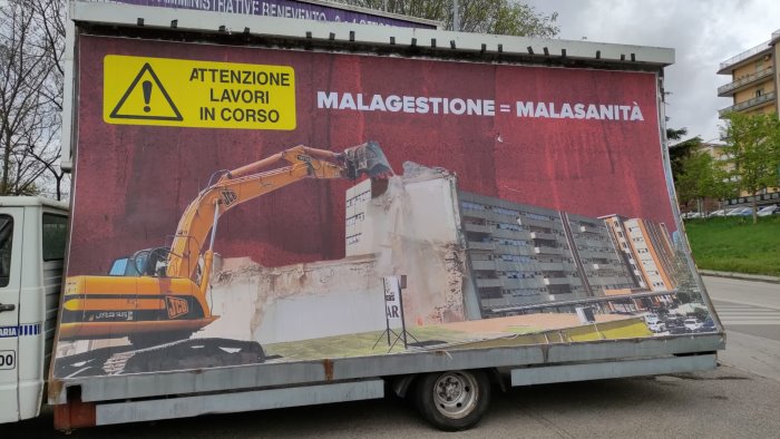 Oggi invece in una stazione di servizio della città, a poche centinaia di metri dall'ospedale San Pio, è comparsa una vela pubblicitaria eloquente: una ruspa che abbatte l'ospedale e la didascalia “Malagestione = Malasanità”.