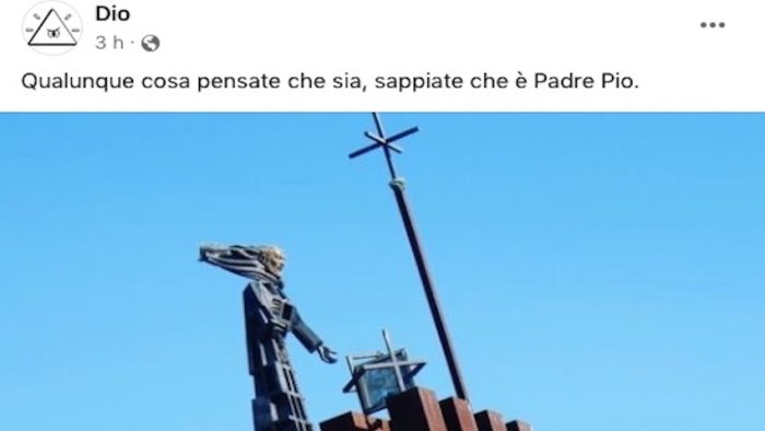 Ebbene, tornando al caso di specie, il celeste titolare della pagina, avente come avatar un triangolo con un occhio al centro, proprio oggi ha citato Benevento, postando la celebre statua di Padre Pio ideata da Aloia e posta alla Rotonda dei Pentri accompagnata dal commento: “Qualunque cosa pensate che sia, sappiate che è Padre Pio”.
