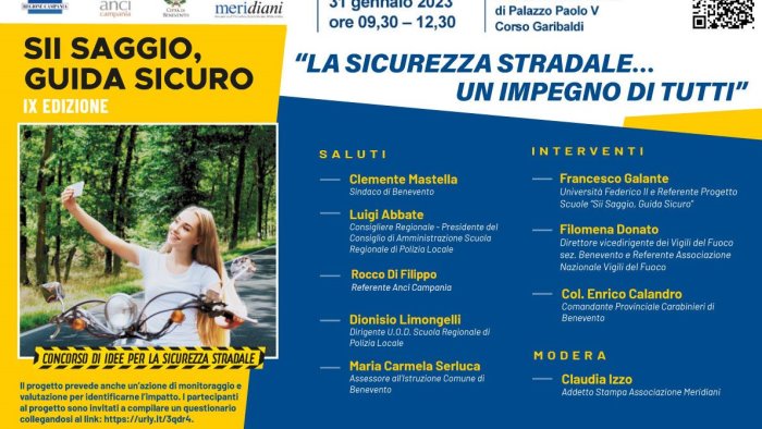 Il roadshow #siisaggioguidasicuro farà tappa alla Sala dell'Antico Teatro di Palazzo Paolo V di Benevento martedì 31 gennaio alle ore 9,30, a cui interverranno oltre 120 studenti del territorio sannita. I saluti istituzionali, nell’ambito dell’evento a Benevento, saranno a cura di: Clemente Mastella, Sindaco di Benevento; Luigi Abbate, Consigliere Regionale - Presidente del Consiglio di Amministrazione Scuola Regionale di Polizia Locale; Rocco Di Filippo, Referente Anci Campania; Dionisio Limongelli, Dirigente U.O.D. Scuola Regionale di Polizia Locale e Maria Carmela Serluca, Assessore all’Istruzione Comune di Benevento. Interverranno: Francesco Galante dell’Università Federico II e Referente Progetto Scuole “Sii Saggio, Guida Sicuro”; Filomena Donato, Direttore vicedirigente dei Vigili del Fuoco sez. Benevento e Referente Associazione Nazionale Vigili del Fuoco e il colonnello Enrico Calandro, Comandante Provinciale dei Carabinieri di Benevento. Modera Claudia Izzo, Addetto stampa dell’Associazione Meridiani. Di impatto e grande sensibilità, lo spot realizzato dai testimonial della manifestazione Gigi e Ross, che viene proiettato nel corso degli incontri formativi.