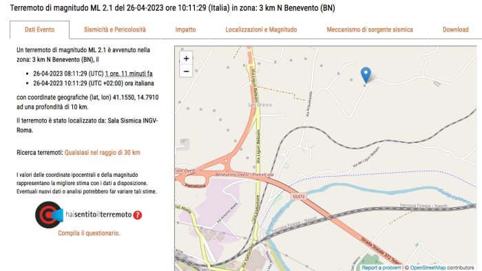 Lieve scossa di terremoto tra Benevento e Pietrelcina