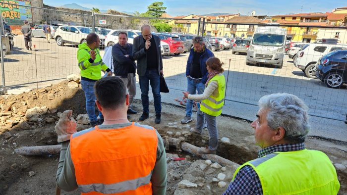 Questa mattina Simone Foresta, della Soprintendenza Archeologica Belle Arti e Paesaggio di Benevento e Caserta, ha condotto un sopralluogo nell'area che sta restituendo i resti degli edifici rasi al suolo dai bombardamenti del 1943 e strutture precedenti. C'è da attendersi dunque un protrarsi dei saggi di scavo.