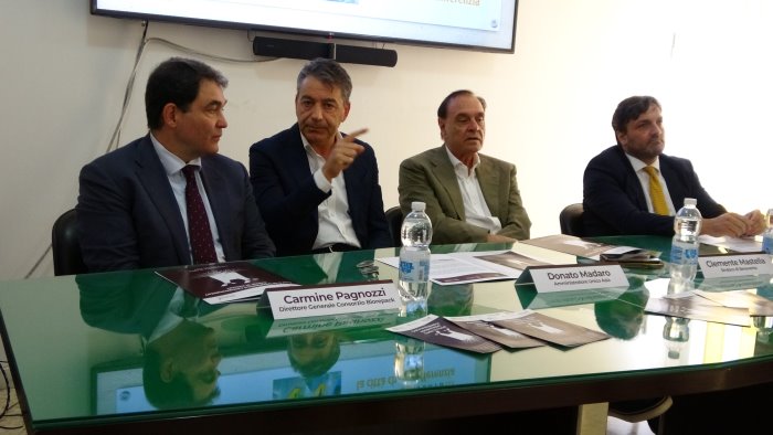 Nella sala riunioni dell'Asia di via della Puglie, l'amministratore unico Donato Madaro, ; il direttore generale del consorzio Biorepack, Carmine Pagnozzi; l'assessore all'Ambiente, Alessandro Rosa e il sindaco di Benevento, Clemente Mastella.