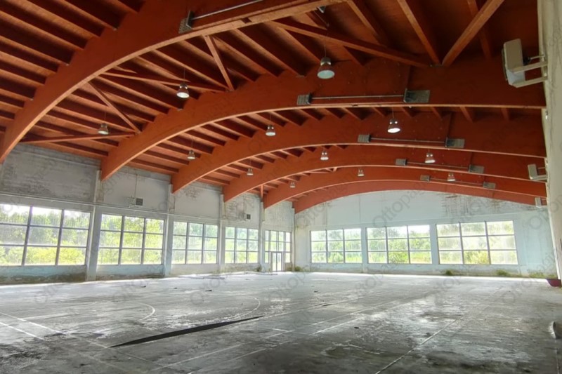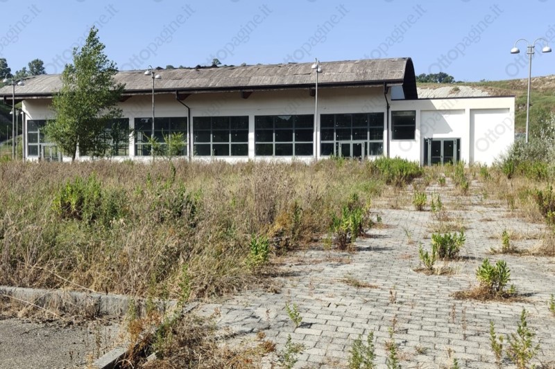 All'interno del palasport, splendide arcate in lamellare di abete coprono tutta la superficie dell'impianto disegnando eleganti curve. Ci sono un campo di basket, palestre, una hall, spogliatoi, bagni, impianto di riscaldamento a gas e impianto di illuminazione. Tutto bello e finito. E tutto abbandonato ai danni del tempo e delle intemperie, oltre che agli sfregi di vandali e saccheggiatori. La vegetazione sta riprendendosi tutto, mangiando i campi di calcetto, bucando l'asfalto del parcheggio e i marciapiedi, e persino l'erba sintetica del campo di calcio. Il vento ha sradicato le guaine impermeabili che ricoprivano il tetto e che ora giacciono ammucchiate nell'erba alta, e la pioggia ha ridotto a una massa grigia il lamellare di legno d'abete. Porte e controsoffittature sono state sventrate, le ceramiche dei bagni divelte o distrutte, la rubinetteria è stata trafugata, così come i quadri elettrici ed i cavi di rame.