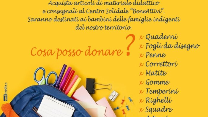 La raccolta del materiale scolastico si terrà da lunedì 4 a sabato 9 settembre e da lunedì 11 a sabato 16 settembre, dalle ore 9:00 alle ore 13:00, presso la sede del Centro Solidale “Bene Attivi” sita in piazza Enrico Maria Fusco 6/7 a Benevento.