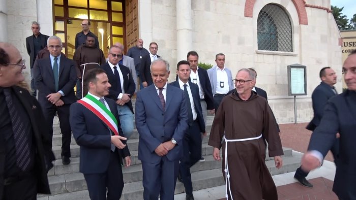 Premio Padre Pio, l'Irpinia ha fatto tris. Il momento intimo spirituale di raccoglimento davanti alla statua di San Pio nella chiesa dei frati di Pietrelcina. Matteo Piantedosi, ministro degli Interni, è anche uomo di fede oltre che autorevole rappresentante delle Istituzioni Statali. La visita nel tempio dei frati accompagnato dal superiore, padre Fortunato Grottola, dal sindaco, Salvatore Mazzone, dall'addetto stampa del premio Padre Pio, Marianna Morante, e da una ristretta rappresentanza di giornalisti. Dopo la preghiera è seguita la benedizione di padre Fortunato sul sagrato della chiesa prima di procedere verso il Palavetro per ricevere il premio internazionale dedicato al frate con le stimmate. Un momento altamente emozionante per il prefetto Piantedosi, irpino verace, che ha voluto dedicarlo ai compianti genitori. Applausi commozione, amarcord.