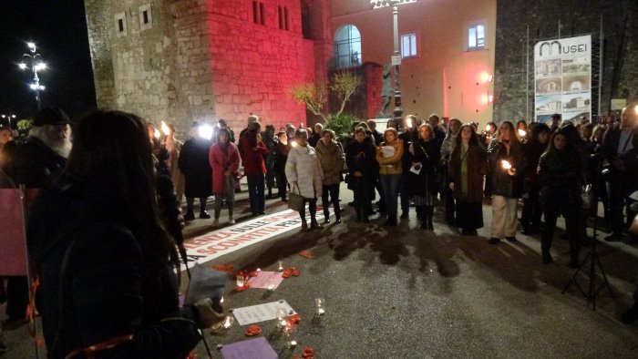 Ad organizzare la fiaccolata è stata la Cgil “per accendere le coscienze, per non stare in silenzio mai più, insieme alle associazioni, agli studenti, ai movimenti politici, alla cittadinanza: non una semplice ricorrenza, ma una giornata di lotta … tutti i giorni. Nessuno colore politico, solo tanta voglia di dire basta e per sempre con la Rocca dei Rettori, sede della Provincia illuminata di rosso al pari dell'Arco di Traiano. Tante le donne, gli uomini e i bambini che hanno acceso le fiaccole.