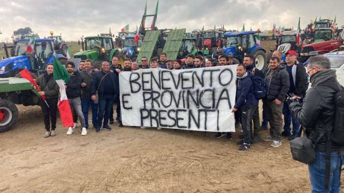 Anche stavolta folta è stata la partecipazione degli agricoltori della provincia di Benevento che sono mobilitati da settimane e da oltre 18 giorni sono fermi alla rotonda dei Pentri in presidio con i trattori che anche oggi sono fermi ai piedi del monumento eretto in onore di San Pio alle porte di Benevento.