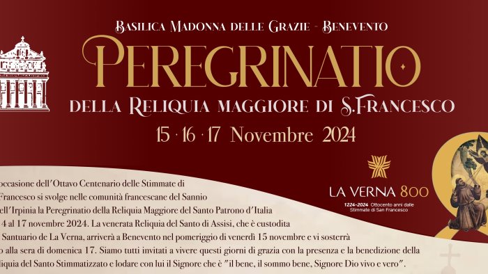 La Reliquia maggiore di San Francesco d’Assisi, venerdì 15 novembre, arriva a Benevento, dopo aver visitato i Conventi della Provincia dei Frati Minori del Sannio e dell’Irpinia: «un lungo pellegrinaggio in varie comunità, per ricordare l’importanza della conformazione a “Cristo povero e Crocifisso”» (Papa Francesco). La Reliquia maggiore è un pezzetto di panno di lino, intriso del sangue del costato di San Francesco, il quale 800 anni fa, nel settembre del 1224, ricevette le Sacre Stimmate sul monte della Verna.