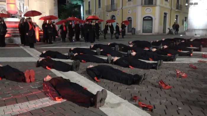 “E' un momento di aggregazione per lanciare un grido di dolore – spiega Carmen Castiello. Per questo abbiamo messo in scena un “funerale”. Queste donne stese a terra come salme riprendo vita attraverso il respiro e gridano insieme contro la violenza. C'è poi il filo rosso che unisce tutti perchè solo stando insieme sosterremo chi subisce violenza per parlare. Siamo tutte dalla loro parte”.