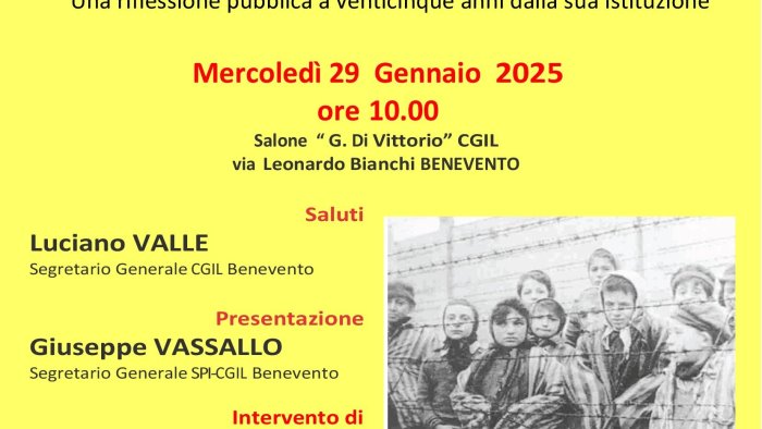 Dopo gli interventi introduttivi di Luciano Valle, segretario generale della CGIL di Benevento, e di Giuseppe Vassallo, segretario generale dello SPI-CGIL di Benevento, Gerarda Mirra, Formatrice della Fondazione Valenzi, relazionerà su “Le donne nella Shoah. Testimonianze e riflessioni” e su “Il racconto del Bene, i Giusti e il bene possibile: Giovanni Palatucci a 80 anni dalla morte!”.