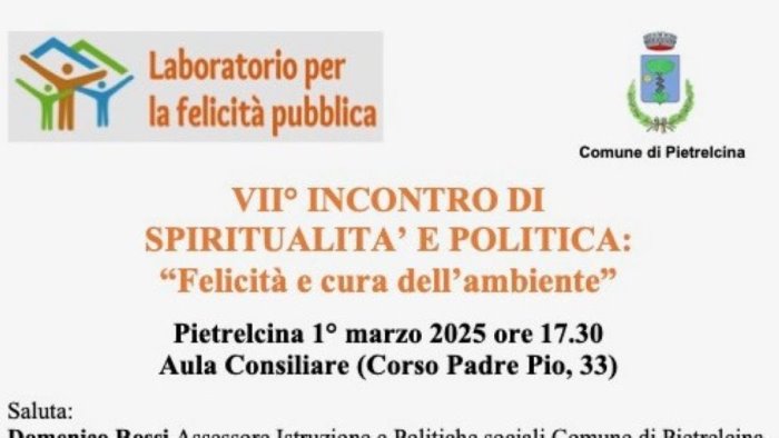 Il Laboratorio per la felicità pubblica e il Comune di Pietrelcina - in partnership con Base Benevento, Argomenti2000 Associazione di amicizia politica, Cesvolab e Archeoclub Pietrelcina -promuovono sabato 1° marzo alle ore 17.30, presso l’Aula Consiliare (Corso Padre Pio, 33 – Pietrelcina), il settimo incontro sul tema: “Spiritualità e politica. Felicità e cura dell’ambiente”.
