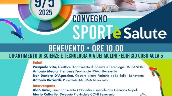L’Unione Sportiva Acli di Benevento organizza il convegno “Sport è Salute”, in programma per venerdì 9 maggio alle 10:00, presso l’Università del Sannio, Edificio CUBO – Aula 5, in via dei Mulini a Benevento.