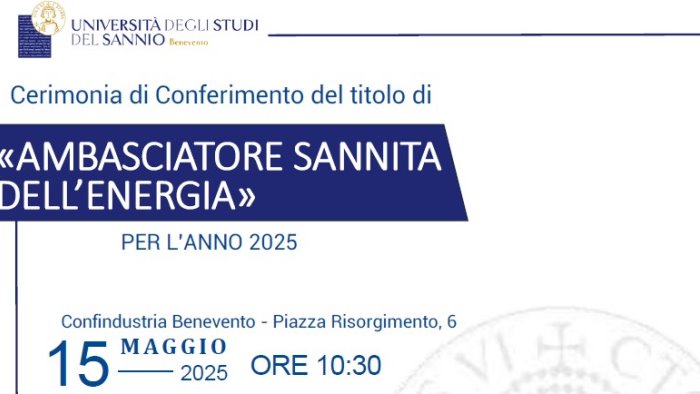 Domani, giovedì 15 maggio, presso la sede di Confindustria Benevento è in programma la cerimonia di consegna del del titolo “Ambasciatore per l’energia” anno 2025.