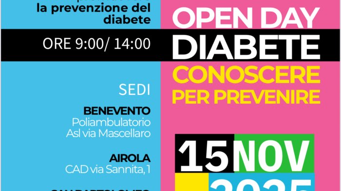 Sabato 15 novembre, dalle ore 9 alle 14, saranno aperti al pubblico i Centri Antidiabete e gli ambulatori delle seguenti sedi: Benevento – Ambulatorio Via Mascellaro; Airola – CAD via Sannita; Morcone – Poliambulatorio via Roma; San Bartolomeo in Galdo – Poliambulatorio via Costa.