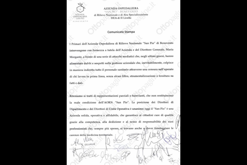 “I Primari dell’Azienda Ospedaliera di Rilievo Nazionale “San Pio” di Benevento intervengono con fermezza a tutela dell’Azienda e del Direttore Generale, Maria Morgante, a fronte di una serie di attacchi mediatici che, negli ultimi giorni, hanno alimentato dubbi e sospetti sulla gestione aziendale che, inevitabilmente, colpisce in maniera indiretta tutto il personale sanitario attraverso una censura sull’operato di chi lavora in prima linea, senza alcun filtro, strumentalizzazione o tessitura su fatti e dati.