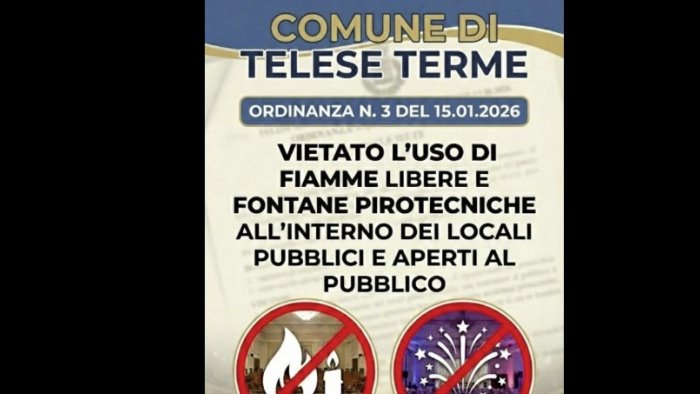 La decisione è stata adottata anche dal Comune di Telese Terme dove il sindaco Giovanni Caporaso ha firmato un'ordinanza con la quale si vieta di utilizzare fiamme libere e articoli pirotecnici, “a qualunque titolo impiegati, all’interno dei locali commerciali e dei pubblici esercizi aperti al pubblico presenti sul territorio comunale.