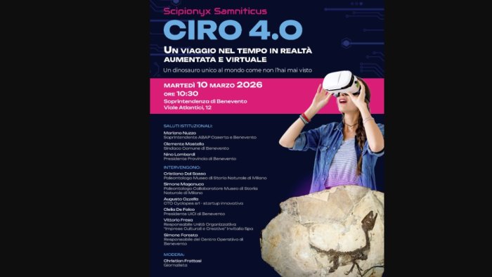Grazie all’utilizzo di tecnologie immersive, realtà aumentata e virtuale, linguaggi narrativi innovativi e strumenti digitali avanzati, CIRO 4.0 offre, infatti, un’esperienza di fruizione completamente nuova, capace di coniugare rigore scientifico, divulgazione e accessibilità, rivolgendosi a un pubblico ampio, incluse le scuole e le persone con disabilità. L’evento di presentazione si aprirà con i saluti istituzionali di Mariano Nuzzo, Soprintendente ABAP per le province di Benevento e Caserta, di Clemente Mastella, sindaco del Comune di Benevento e di Nino Lombardi, presidente della Provincia di Benevento. Seguiranno gli interventi di Cristiano Dal Sasso, paleontologo – Museo di Storia Naturale di Milano, di Simone Maganuco, Paleontologo – collaboratore del Museo di Storia Naturale di Milano, di Augusto Ozzella, CTO Cyclopes srl – startup innovativa, di Clelia De Falco, presidente UICI Benevento e di Vittorio Fresa, Responsabile Unità Organizzativa “Imprese Culturali e Creative” – Invitalia Spa. Le conclusioni saranno affidate a Simone Foresta, responsabile del Centro Operativo di Benevento, moderato dal giornalista Christian Frattasi.