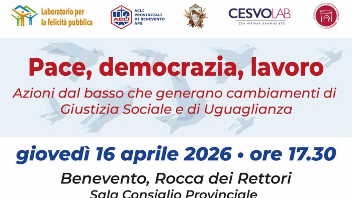 “Pace, democrazia, lavoro. Azioni dal basso che generano cambiamenti di giustizia sociale e di uguaglianza”. È il titolo dell’incontro in programma giovedì 16 aprile 2026 alle ore 17.30 presso la Rocca dei Rettori di Benevento, nella sala del Consiglio provinciale.