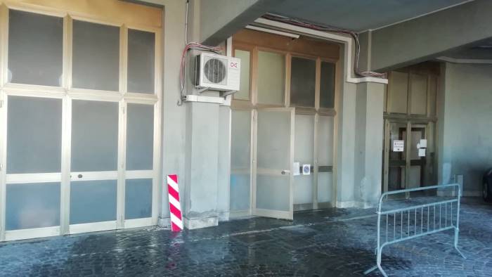 Questa mattina gli addetti alle pulizie stanno provvedendo ad aspirare l'acqua finita sul pavimento del primo piano, dove hanno sede le aule per le udienze.