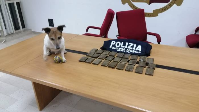 E' l'epilogo di una perquisizione condotta nella sua abitazione con il supporto di due cani antidroga - in particolare, di Pocho, un Jack Rusel Terrier - giunti da Napoli. Un'attività che ha consentito di rinvenire e sequestrare 3 grammi di hashish nell'auto e, in casa, i 27 panetti della stessa sostanza.