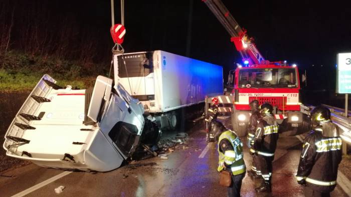 E' accaduto poco prima del casello autostradale, di Castel del Lago: è qui che, secondo una prima ricostruzione, e per cause da accertare, il conducente ha perso il controllo del camion- frigorifero di cui era alla guida, che è finito fuiori strada e si è ribaltato.