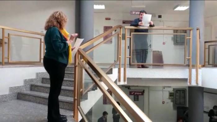 Si sono dati tutti appuntamento lungo le scale dal secondo al quinto piano, protagonisti di una iniziativa che per qualche minuto ha allontanato il clima di paura nel quale siamo tutti immersi. Un flashmob ideato da Maria Rosaria Francesca, una dipendente per la quale il canto è più di una semplice passione, che ha immediatamente incrociato il consenso dei colleghi.