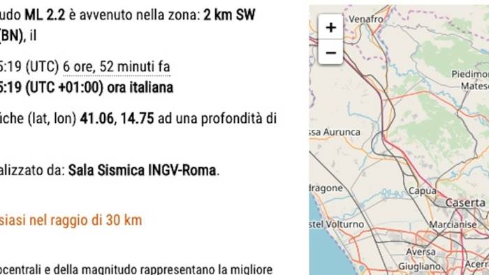 La terra ha tremato all'2.25 a una magnitudo di 2.2 a due chilometri da San Leucio del Sannio, poi ancora alle 06:54, magnitudo 2.2 ad un 1 chilometro da Ceppaloni e ancora con epicentro a due chilometri da Ceppaloni alle 07:01.