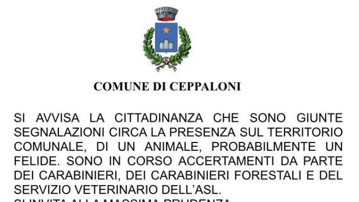 “Si avvisa la cittadinanza che sono giunte segnalazioni circa la presenza sul territorio comunale di un animale, probabilmente un felide. Sono in corso accertamenti da parte dei carabinieri forestali e del Servizio veterinario dell'Asl. Si invita alla massima prudenza".