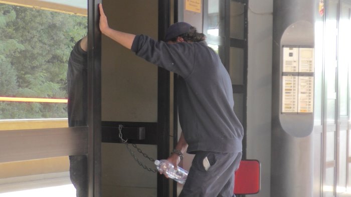 Questa notte l'operaio si è nuovamente incatenato al portone del palazzo dove ha sede la Società.