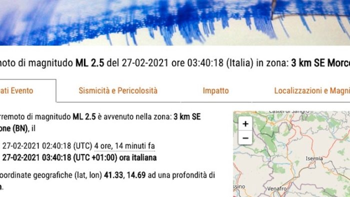 Con epicentro a Morcone diversi eventi sismici con magnitudo di intensità compresa tra i 2.1 e i 2.5. La scossa più forte appunto di Un terremoto di magnitudo 2.5 è avvenuto alle 02:40 ad una profondità di10 km.