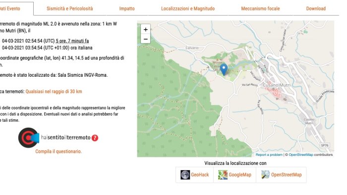 Ancora una lieve scossa di terremoto nella zona del Matese e Tammaro. Dopo quella registrata cinque giorni fa nell'area di Morcone, la scorsa notte i sismografi dell'Istituto di geofisica e vulcanologia dell'Ingv hanno segnalato una scossa a Cusano Mutri di magnitudo 2 in piena notte. Il movimento tellurico, con epicentro alle pendici del Monte Caruso, non è stato avvertito dalla popolazione e non ha creato danni vista la bassa intensità.