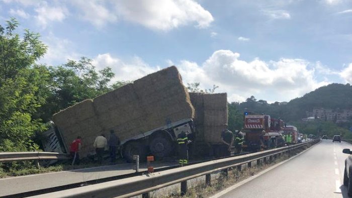 Traffico bloccato lungo ungo il raccordo a Benevento, nel tratto tra la galleria Avellola e lo stadio - rione Libertà, a causa di un autotreno carico di balle di paglia finito fuori strada. La motrice e la cabina del mezzo sono infatti adagiati lungo la scarpata, mentre il rimorchio è rimasto sulla sede stradale. Scattato l'allarme sul posto sono intervenuti i vigili del fuoco del comando provinciale e gli agenti delle volanti e della polizia stradale. Per fortuna nessuna grave conseguenza per l'autista e un'altra persona in sua compagnia. Necessario chiudere il tratto del raccordo per consentire ai mezzi di soccorso di spostare il grosso e pesante camion con sopra centinaia di balloni di paglia.