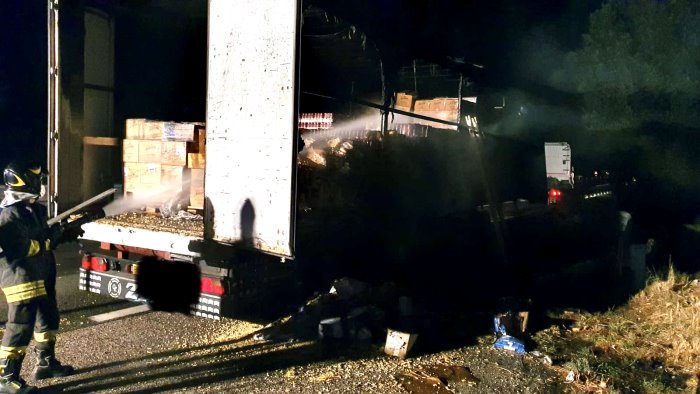Momenti di paura per il conducente di un autoarticolato interessato da un incendio. Il mezzo pesante, carico di pasta, stava percorrendo la statale 372 quando nei pressi dello svincolo Benevento ovest - Pietrelcina sono divampate le fiamme che hanno interessato la copertura del rimorchio. Il camionista si è accorto di quello che stava accadendo ed ha immediatamente arrestato la marcia e chiamato i soccorsi. Sul posto due squadre dei vigili del fuoco e gli agenti della polizia stradale. Non è escluso che a provocare l'incendio sia stato lo scoppio di uno pneumatico ed il conseguente attrito. Traffico rallentato per consentire le operazioni di spegnimento è messa in sicurezza dell'arteria. Non si esclude che per la rimozione del mezzo pesante si debba chiudere la carreggiata con uscita obbligatoria alla rotonda dei Pentri. Sul posto anche personale dell'Anas.