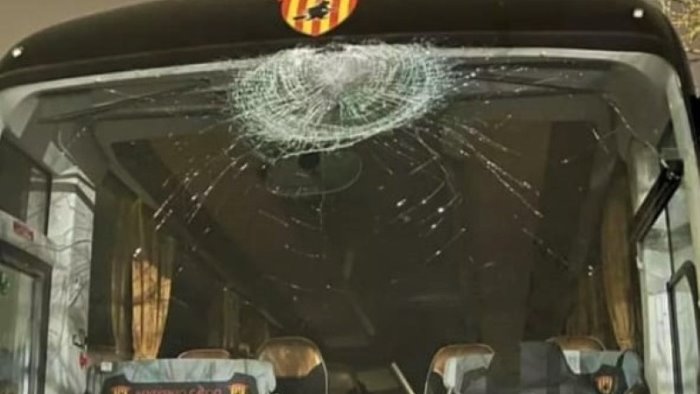 Il pullman che trasportava la squadra di calcio del Benevento a Perugia, per la partita di serie B prevista oggi pomeriggio al Curi, è stato colpito da una grande pietra che ha mandato in frantumi il vetro anteriore.