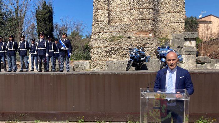 Il Questore ha ringraziato le autorità presenti, a partire dal Prefetto di Benevento, Carlo Torlontano, il presidente del Tribunale, Marilisa Rinaldi, il procuratore capo Aldo Policastro e tutti i vertici delle forze dell'ordine presenti al pari del sindaco di Benevento Clemente Mastella – tra gli altri presenti anche la senatrice Sandra Lonardo e il deputato Pasquale Maglione -. Sui gradoni del Teatro Romano tanti gli alunni arrivati da alcune scuole sannite e i sindaci. Il numero uno degli Uffici di via De Caro ha voluto ringraziare i sindacati, l'associazione nazionale della polizia di stato e ricordato, con una deposizione di una corona dinanzi al monumento in Questura, i caduti del Corpo.