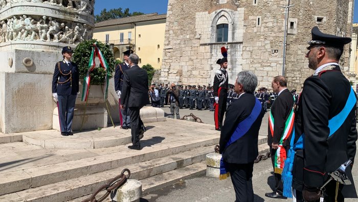 Il sole picchia che è una bellezza, ma c'è più gente rispetto al passato, e non quello immediatamente prossimo dell'emergenza sanitaria. Con gli immancabili telefonini alcuni residenti fotografano e riprendono dai balconi delle loro abitazioni quanto succede in piazza Castello. Si festeggiano i 76 anni di vita della Repubblica italiana, il copione è immancabilmente lo stesso. L'inno di Mameli e le note struggenti del silenzio contrappuntano l'alzabandiera e l'onore reso ai caduti con una corona depositata ai piedi del Monumento a loro dedicato. Fa caldo, i più entusiasti sono ovviamente i bambini, mentre chi è là con l'età viaggia con la memoria a ritroso.