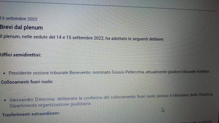 La notizia – vedi la foto – è stata pubblicata sul sito istituzione del Consiglio superiore della magistratura. Ma contiene un errore - può capitare -, perchè il giudice Sossio Pellecchia è stato nominato presidente di sezione del Tribunale di Avellino, dove opera già, e non del Tribunale di Benevento, come scrive il portale. E come avevamo riportato.