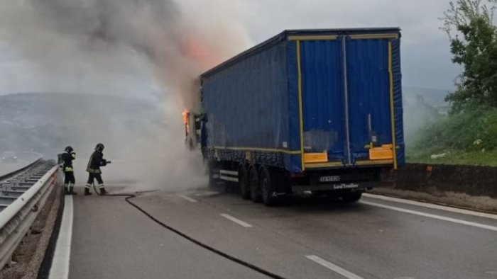 Momenti di paura, ma nessuna conseguenza per le persone, per l'incendio divampato lungo il raccordo autostradale, nel tratto tra lo svincolo di Castel del Lago e San Giorgio del Sannio. E' qui che, per cause in corso di accertam ento, ha preso fuoco il tir di un'azienda di trasporti della provincia di Salerno.