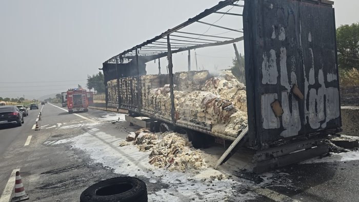 Scattato l'alalrme, sul posto sono accorsi i vigili del fuoco del comando provinciale e del distaccamento di Vitulano e le forze dell'ordine. Lunghe e complesse le operazioni per spegnere le fiamme. Completamente distrutto il rimorchio centinato e il prezioso carico. Sul pianale, infatti, quintali e quintali di farina andata in fumo.