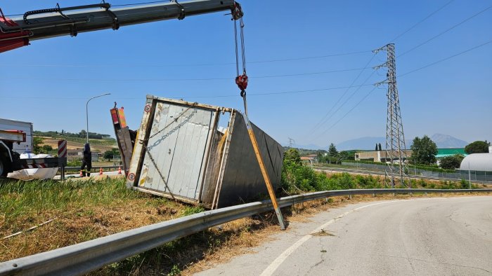 È accaduto intorno alle 11 quando, per cause in corso di accertamento il conducente, di Bojano in provincia di Campobasso, nell'affrontare la rampa di immissione ha perso il controllo del mezzo carico di lolla, detta anche pula o loppa, ovvero un sottoprodotto derivante dalla lavorazione dei cereali, grano in questo caso, che aveva caricato in un deposito all'interno della zona industriale.