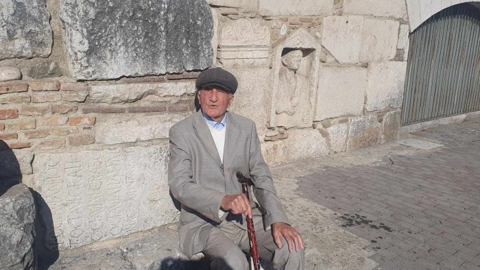 Arriva in piazza Castello in largo anticipo. E' vestito di tutto punto, indossa una coppola e per camminare si appoggia ad un bastone. Si accomoda su un gradone alla base della Rocca dei Rettori e mi fissa. Si è accorto che lo sto guardando, è lui a rompere il ghiaccio.