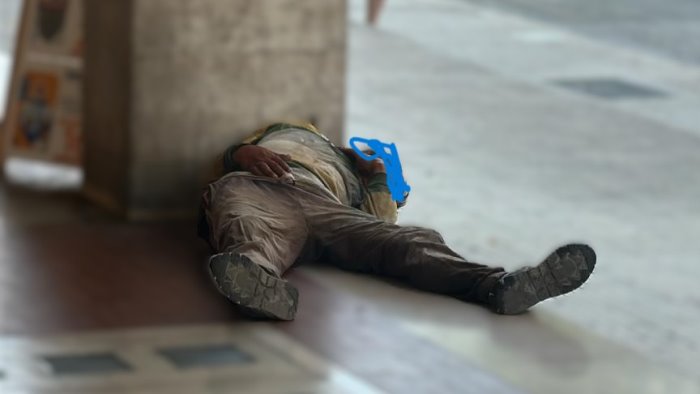 Riverso sull'asfalto, in preda al sonno o, forse, ai postumi dell'assunzione di alcol. Una scena alla quale hanno assistito tutti coloro che sono transitati da quelle parti, qualcuno si è anche avvicinato, beccandosi la reazione stizzita dell'uomo, che non voleva essere infastidito.