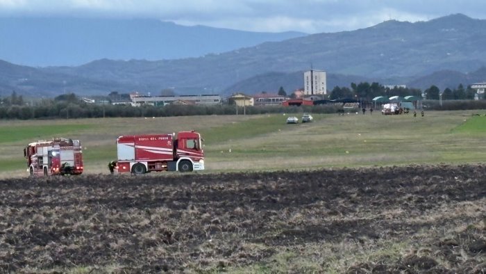 Tutto è accaduto all'interno del campo di volo, dove il velivolo, per cause in corso di accertamento, si è schiantato tra due hangar. Mancava poco alle 16, il tempo era buono, l'ipotesi più accreditata è quella di una gusto tecnico.