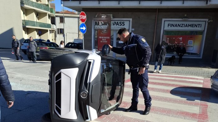 In seguito all'arto, la piccola auto si è ribaltata al centro della carreggiata.