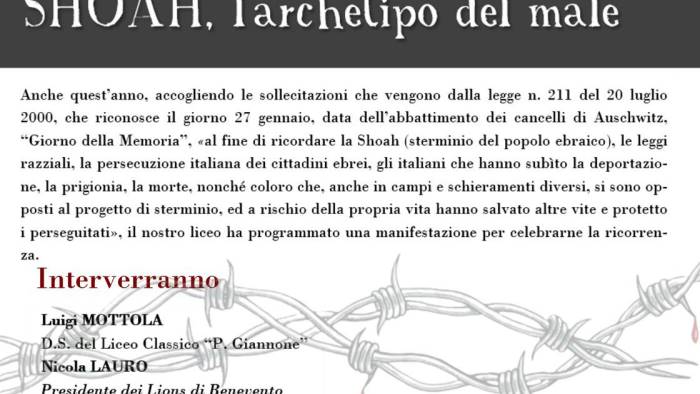 In vista della Giornata della memoria del 27 gennaio, il Liceo classico Pietro Giannone e il Lions club Benevento host, per ricordare la Shoah, hanno organizzato una manifestazione (“ Shoah: l'archetipo del male”, il nome) per non dimenticare lo sterminio del popolo ebraico, le leggi razziali, la persecuzione italiana dei cittadini ebrei, gli italiani che hanno subito la deportazione, la prigionia la morte, nonché coloro che, anche in campi e schieramenti diversi, si sono opposti al progetto di sterminio ed a rischio della propria vita hanno salvato altre vite e protetto i perseguitati.