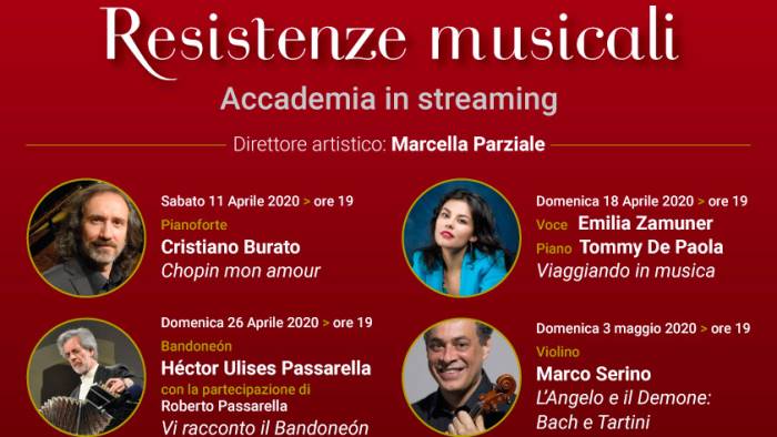 Con Resistenze Musicali, per la direzione artistica di Marcella Parziale, l’Accademia di Santa Sofia torna, questa volta non dal vivo ma sulla sua pagina Facebook, sempre tenendo fede alla sua missione primaria di promotrice e divulgatrice di musica e cultura, con la messa in streaming di un programma variegato di incontri che spazieranno dalla musica classica al jazz, con mirabili artisti, concertisti di fama, talentuosi esecutori e interpreti d’eccezione, che in certi casi hanno fatto la storia della musica del nostro paese contribuendo ad esempio all’incisione di alcune tra le più famose colonne sonore del cinema italiano.